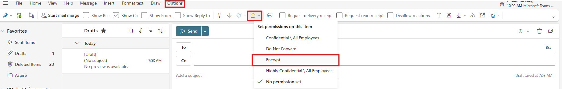 When sending any sensitive or personal information, it is good practice to encrypt the email. If it so happens that nefarious actors do intercept a message with important information, they should not be able to use it. Microsoft Outlook has the encryption function available for any email you compose.